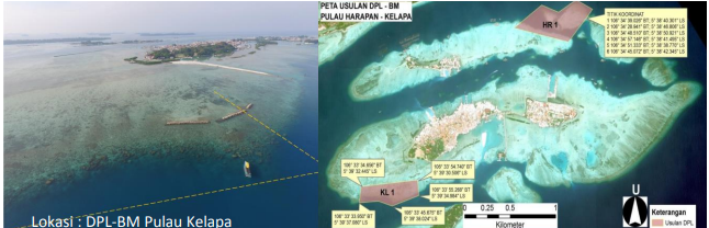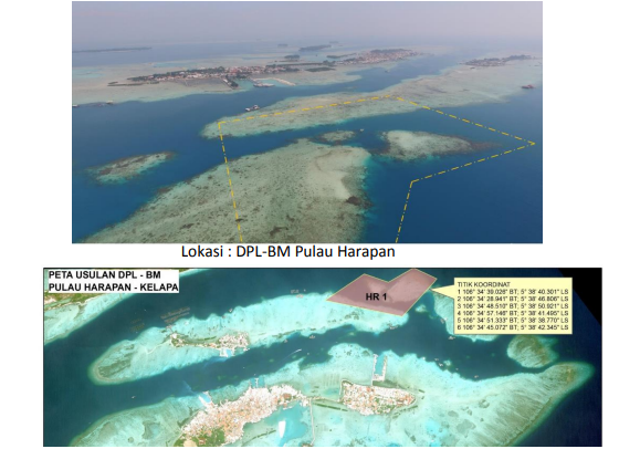 Dari hasil penelitian dan analisis yang dilakuan untuk daerah Pulau Harapan dilakukan dengan membuat PU dengan panjang sisi 25 m, jumlah PU yang terbentuk yaitu 4.284 PU dengan luas masing-masing yaitu 0,162 ha. Hasil analisis lokasi potensial di sekitar Pulau Harapan dan Pulau Kelapa ditemukan cukup banyak area yang terpilih dengan frekuensi 80-100. Namun karena beberapa lokasi tidak memungkinkan untuk dijadikan DPL, misalnya karean jalur transportasi (lalu lintas kapal) dan adanya KJA untuk budidaya, maka area potensial yang diidentifikasi di sekitar Pulau Harapan dan Pulau Kelapa di 4 lokasi. Keempat lokasi yang dimaksud yaitu sebelah Timur Kelapa Dua, sebelah Tenggara Harapan, sebelah Barat Kelapa, dan Barat Daya Kelapa. Jumlah PU serta luas total area dengan keterpilihan di atas 80 kali, adapun sebaran lokasi keterpilihan 4 lokasi dimaksud antara lain sebagai berikut :